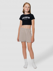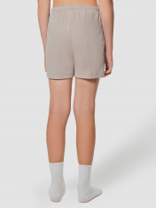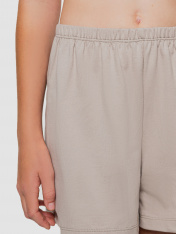 Шорты свободного силуэта. Пояс цельнокроеный с эл. тесьмой внутри (внутренняя резиной 20RV), ширина 20 мм. Низ шортов обработан на 2-х игольной плоскошовной машине швом в подгибку.