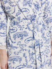 Халат прямого силуэта, длина до колен. Спинка цельнокроеная. Халат с запахом, со съемным поясом, продетым в шлевки в боковых швах. На уровне талии притачены завязки для дополнительной фиксации левой полы халата. Концы пояса свободно завязываются. Рукава длинные. Срезы борта и горловины.