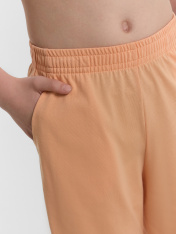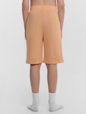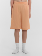 Футболка свободного силуэта. Горловина круглой формы, обтачка из ребаны. Рукава втачные свободные, линия плеча слегка спущена. Низ рукавов и футболки в подгибку. Шорты ниже колена, свободного силуэта с высокой посадкой на талии. Спереди карманы с отрезным бочком. Пояс цельнокроеный внутри с резиной 40RV. Низ шор в подгибку.