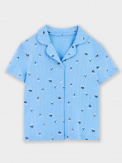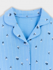 Комплект состоит из рубашки и шорт. Рубашка прямого силуэта, с отложным воротником, спинка цельнокроеная. Плечо слегка спущено. Рукав втачной, одношовный, короткий. Центральная застежка на пуговицы._x000D_ Шорты слегка расширены к низу. Пояс цельнокроеныйс эластичной тесьмой внутри. Низ застрочен швом в подгибку.