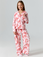 Пижама для девочек с новогодним принтом — праздничный комплект для комфортного сна. Набор состоит из рубашки прямого кроя и брюк, выполненных из натурального хлопка._x000D_ Рубашка с отложным воротником и длинными рукавами создает элегантный силуэт. Центральная застежка на пуговицы и слегка спущенное плечо обеспечивают удобство использования. Брюки с эластичным поясом мягко сидят по фигуре, не стесняя движений во время сна._x000D_ Натуральный хлопок обеспечивает отличную воздухопроницаемость, позволяя кожедышать на протяжении ночи. Материал сохраняет мягкость и форму после многократных стирок, не вызывая раздражения даже у чувствительной кожи. Плотность ткани оптимальна для всех сезонов — согревает в прохладные вечера и не вызывает перегрева в теплыеночи.<br>_x000D_ <br>_x000D_ Яркий новогодний принт создает праздничное настроение. Пижама станет прекрасным выбором для зимних праздников и уютных семейных вечеров_x000D_