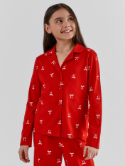 Пижама для девочек с новогодним принтом — праздничный комплект для комфортного сна. Набор состоит из рубашки прямого кроя и брюк, выполненных из натурального хлопка._x000D_ Рубашка с отложным воротником и длинными рукавами создает элегантный силуэт. Центральная застежка на пуговицы и слегка спущенное плечо обеспечивают удобство использования. Брюки с эластичным поясом мягко сидят по фигуре, не стесняя движений во время сна._x000D_ Натуральный хлопок обеспечивает отличную воздухопроницаемость, позволяя кожедышать на протяжении ночи. Материал сохраняет мягкость и форму после многократных стирок, не вызывая раздражения даже у чувствительной кожи. Плотность ткани оптимальна для всех сезонов — согревает в прохладные вечера и не вызывает перегрева в теплыеночи.<br>_x000D_ <br>_x000D_ Яркий новогодний принт создает праздничное настроение. Пижама станет прекрасным выбором для зимних праздников и уютных семейных вечеров_x000D_