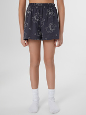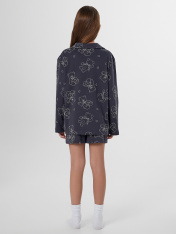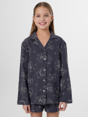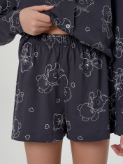 Пижама для девочек с милым принтом — это уютный комплект для сладкого сна и отдыха. Он состоит из рубашки свободного кроя и удобных шортов из мягкого хлопка._x000D_ Рубашка прямого силуэта с отложным воротником и длинными рукавами спокойного, лаконичного дизайна. <br>_x000D_ <br>_x000D_ Центральная застежка на пуговицах и слегка спущенное плечо обеспечивают удобство во время сна. Короткие шорты со средней посадкой на талии хорошо сочетаются с верхом. Пояс со встроенной эластичной тесьмой мягко фиксируется, не сдавливая, а аккуратно подшитые края рубашки и шортов выглядят чисто и аккуратно.<br>_x000D_ <br>_x000D_ Весь комплект выполнен из хлопка. Этот натуральный материал не раздражает кожу и обеспечивает комфорт. Тёмно-серый графитовый фон с очаровательными медвежатамисоздаёт спокойную и уютную атмосферу, настраивая на отдых. _x000D_