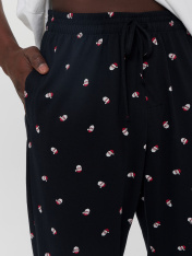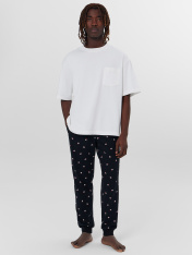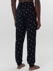 Брюки мужские изготовлены из трикотажного полотна кулирка. Брюки прямого силуэта, с классической линией талии. Пояс цельнокроеный с эластичной тесьмой внутри. В передней части пояса с лицевой стороны пробиты петли и втянут шнур из основного полотна.В боковых швах обработаны карманы. На передней левой половинке проложены строчки имитация гульфика._x000D_ По низу брюк отрезные манжеты из рибаны..