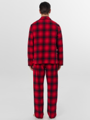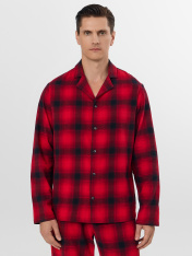 Мужской домашний комплект в классическую клетку станет идеальным спутником для отдыха. Пижама, состоящая из рубашки и брюк, выполнена из хлопка, который дарит коже приятные ощущения и обеспечивает комфорт весь день. Свободная рубашка прямого силуэтас V-образным вырезом и отложным воротником выглядит элегантно и не сковывает движений. Длинные рукава со спущенным плечом и аккуратно обработанными манжетами дополняют образ. Прямые брюки с удобным цельнокроеным поясом на эластичной тесьме мягко сидят по фигуре. Практичные боковые карманы и аккуратная обработка низа подчеркивают качество исполнения.<br>_x000D_ <br>_x000D_ Доминантой дизайна выступает стильная клетка, а тонкое сочетание с полоской придает комплекту особый шарм и визуальную глубину. Мягкая дышащая ткань обеспечивает идеальный микроклимат, делая этот комплект прекрасным выбором для расслабленного вечера или полноценного ночного отдыха в прохладный сезон.