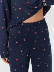 Домашний комплект с нежным узором создает атмосферу спокойного уюта. Этот гармоничный набор из лонгслива и брюк станет верным спутником ваших расслабленных вечеров и моментов отдыха._x000D_ Лонгслив свободного кроя с круглой горловиной и длинными рукавамиподарит ощущение невесомости. Брюки прямого силуэта с эластичным поясом мягко фиксируются на талии, не стесняя движений во время сна или домашних дел.<br>_x000D_ <br>_x000D_ Комплект выполнен из полиэстера с добавлением эластана. Такой состав обеспечивает прочность ткани и идеальное облегание, сохраняя форму после множества стирок. Материал обладает легкостью и мягкостью, даря приятные тактильные ощущения.<br>_x000D_ <br>_x000D_ Нежный синий цвет с изящным узором создает настроение гармонии и безмятежности. <br>_x000D_ Комплект идеален для спокойного сна, утреннего кофе или вечернего отдыха, сочетая в себе практичность и эстетику домашней одежды._x000D_