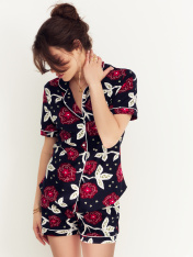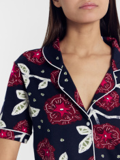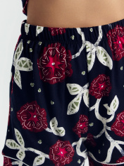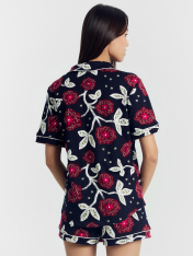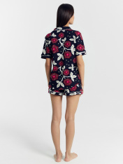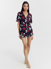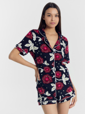 Хлопковый женский комплект актуального свободного силуэта. Рубашка прямая, с отложным воротником и лацканами, короткими рукавами, застегивается на пуговицы. Дополняют ее свободные шорты длины мини, с резиновой тесьмой в поясе и атласной тесьмой, которая завязывается на бантик. Особенность модели – контрастные канты на рукавах, воротнике и передней части рубашки. Рекомендуем для сна, отдыха и домашних дел!