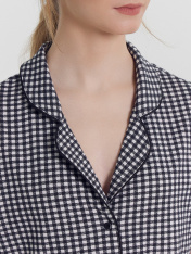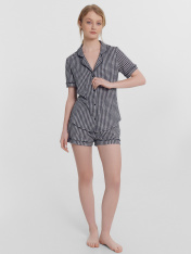Хлопковый женский комплект актуального свободного силуэта. Рубашка прямая, с отложным воротником и лацканами, короткими рукавами, застегивается на пуговицы. Дополняют ее свободные шорты длины мини, с резиновой тесьмой в поясе и атласной тесьмой, которая завязывается на бантик. Особенность модели – контрастные канты на рукавах, воротнике и передней части рубашки. Рекомендуем для сна, отдыха и домашних дел!