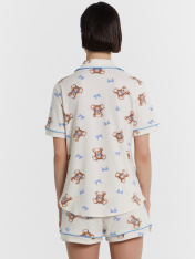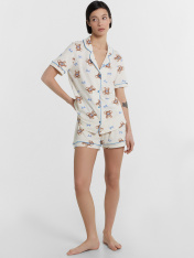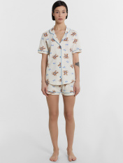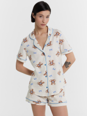 Женская хлопковая пижама свободного силуэта – идеальный выбор для комфортного и стильного отдыха. Рубашка прямого кроя с отложным воротником и лацканами, короткими рукавами и застежкой на пуговицы добавляет элегантности и удобства. Свободные шорты длины мини с эластичным поясом и атласной тесьмой, завязывающейся на бантик, обеспечивают дополнительный комфорт и очарование. Особенностью этой модели являются контрастные канты на рукавах, воротнике и передней части рубашки, что придает ей стильный и утонченный вид. Эта пижама станет отличным вариантом для сна, отдыха и выполнения домашних дел, даря вам комфорт и красоту в каждом моменте. Рекомендуем эту милую модель для самых любимых!