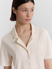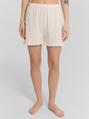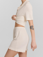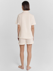Эта женская пижама свободного силуэта — воплощение элегантности и комфорта, созданное для повседневного уюта. Изготовленная из высококачественного хлопка, она дарит приятные тактильные ощущения, легкость и воздухопроницаемость, обеспечивая максимальный комфорт как днем, так и ночью. Материал не только мягкий и натуральный, но и слегка тянущийся, что позволяет пижаме прекрасно сидеть на фигуре, не сковывая движений. Верх комплекта представляет собой рубашку с отложным воротником и лацканами, украшенными атласным кантом, что добавляет изделию утонченности и изысканного шарма. Короткие рукава делают модель подходящей для теплого времени года, а центральная застежка на пуговицах сочетает функциональность и стиль. Шорты, дополняющие комплект, выполнены в свободном силуэте и декорированы очаровательными рюшами по низу. Этот элемент вносит женственность и легкий акцент игривости в образ. Практичный, но стильный дизайн позволяет использовать эту пижаму не только для сна, но и для домашних дел, сохраняя уют и красоту в любом моменте. Модель идеально подходит для весны и лета, предлагая функциональность и изящество в одном изделии. Рекомендуем для создания гармоничного домашнего гардероба!