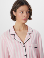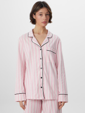 Женская пижама из мягкого хлопка — это уютный комплект для комфортного отдыха и полноценного сна. Набор включает свободный жакет и прямые брюки, выполненные из высококачественного натурального материала. _x000D_ Жакет прямого кроя с V-образным вырезом и отложным воротником застегивается на пуговицы. Дизайнерским акцентом стало оформление краев борта и воротника контрастным кантом, придающее модели особую изысканность. <br>_x000D_ <br>_x000D_ Брюки прямого свободного кроя с средней посадкой на талии создают максимальный комфорт. Широкий пояс со скрытой мягкой резинкой бережно облегает фигуру, не создавая давления, а элегантные отрезные манжеты по низу с контрастными кантами гармонично завершают образ. Пижама обладает исключительной мягкостью, не вызывает раздражения кожи, сохраняет форму после многократных стирок.<br>_x000D_ <br>_x000D_ Универсальный комплект станет идеальным спутником для ежедневного отдыха дома — продуманный крой, дышащая ткань и классический дизайн делают эту пижаму прекрасным выбором для тех, кто стремится к гармонии комфорта и стиля в повседневной жизни._x000D_ _x000D_ _x000D_ _x000D_ _x000D_
