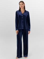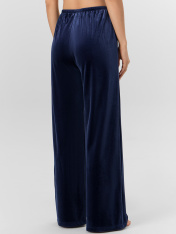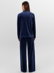 Жакет прямого силуэта. Горловина V-образной формы с отложным воротником и лацканами. По переду обработана центральная застежка на петли и пуговицы (D10 мм). Рукава втачные длинные. Нижний срез жакета и рукавов обработан швом вподгибку. Брюки прямые,свободные. Посадка средняя. Пояс цельнокроеный с эластичной тесьмой внутри (внутр. 20мм 20RV). Нижний срез брюк обработан швом вподгибку