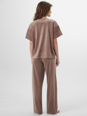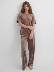 Розовая домашняя пижама для женщин — это уют и элегантность в каждой детали. Комплект состоит из свободного джемпера и прямых брюк, выполненных из мягкой ткани, которая обеспечивает легкость, износостойкость и идеальную посадку._x000D_ Джемпер прямого кроя с круглой горловиной и короткими рукавами не сковывает движения, а аккуратная обработка швов гарантирует комфорт. Брюки с высокой посадкой и широким эластичным поясом мягко фиксируются на талии, а практичные карманы-«хулиганы» добавляют функциональности.<br>_x000D_ <br>_x000D_ Пижама подойдет для отдыха, сна или уютных вечеров дома. Если вы ищете, где купить женскую домашнюю пижаму, которая сочетает качественные материалы, продуманный крой и нежный розовый оттенок, этот набор станет отличным выбором._x000D_ _x000D_