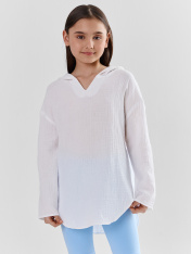 Туника для девочек свободного силуэта с капюшоном, выполнена из муслина. Горловина V-образная. Длина - ниже бедра. _x000D_ Спинка удлиненная. Рукава длинные втачные, линия плеча спущена._x000D_ Низ изделия и рукавов обработаны в подгибку. _x000D_