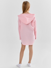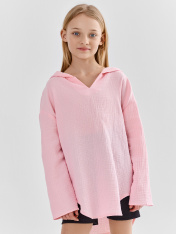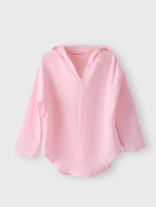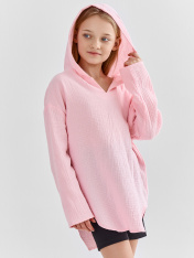 Туника для девочек свободного силуэта с капюшоном, выполнена из муслина. Горловина V-образная. Длина - ниже бедра. _x000D_ Спинка удлиненная. Рукава длинные втачные, линия плеча спущена._x000D_ Низ изделия и рукавов обработаны в подгибку. _x000D_
