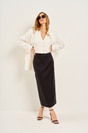 Юбка длинная, зауженная к низу на подкладке, с застежкой на тесьму" молния" в среднем шве заднего полотнища юбки. На переднем и заднем полотнище юбки вытачки . В среднем шве заднего полотнища юбки обработан разрез. Верхний срез юбки обработан обтачкой .