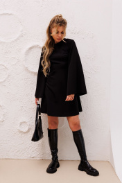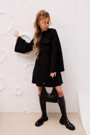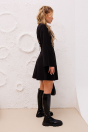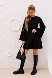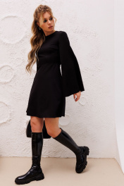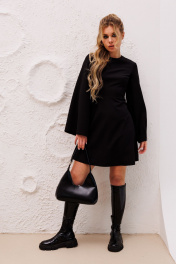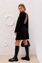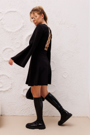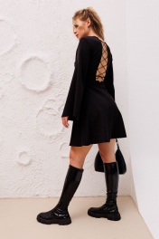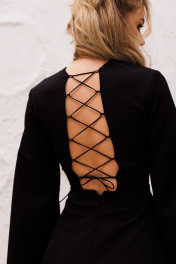 Элегантное платье приталенного силуэта Платье изящного объема, отрезное по талии, с нагрудными и талиевыми вытачками. Спинка украшена фигурным вырезом с открытой частью на уровне талии и декоративной шнуровкой. Горловина округлая, рукава длинные, слегка расширенные книзу. Застежка на потайную молнию расположена в среднем шве спинки. Верх платья на подкладке, длина — выше колена.Длина от талии - 50-52 см, Длина рукава - 57 см-60 см, длина по спине - 86-88