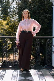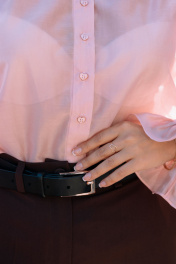 Блузка прямого силуэта,умеренного обема. Из легкого полупрозрачного материала.По верхнему срузу полочки сборка. У блузки спущенна линия плеча.Рукав длинный, расширен к низу. По нижнему срезу рукава сборка с рюшей. Застежка на обметанные петли и пуговицы. Длина изделия до середины бедра. Длина по спинке 66 см +-1 , Длина руква от шеи 80-83 см.