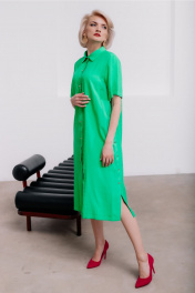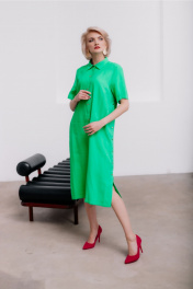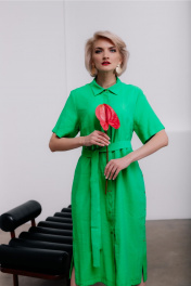 Платье прямого силуэта с коротким втачным рукавом и центральной супатной застежкой на петли и пуговицы. Круглый вырез горловины обработан рубашечным воротником на отрезной стойке. Спинка с отрезной кокеткой. Перед с нагрудными вытачками. В боковых швах планки с застежкой на петли и пуговицы. Центральная планка застежки декорирована золотой фурнитурой. Низ платья и рукавов подогнут. Платье укомплектовано поясом.