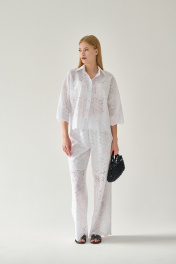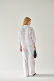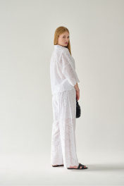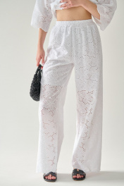 Брюки из 100% хлопка «ришелье» - настоящая находка в жаркий летний сезон! Их прямой крой не сковывает движений, но вместе с тем они идеально садятся по фигуре. Для вашего удобства в верхней части брюк предусмотрена подкладка из 100% однотонного хлопка (имитация коротких шорт). Притачной пояс на резинке, что одновременно добавляет комфорта в носке и подчеркивает силуэт. Фигурный край брючин добавит уникальности в любой ваш образ, а при желании вы можете собрать комплект, скомбинировав брюки со свободной блузкой с таким же фигурным низом (модель 851с или 853с). Такой комплект обязательно будет притягивать к себе взгляды, в то время как натуральность состава ткани обеспечит легкость в носке, воздухопроницаемость и гигроскопичность. Все эти качества по праву выведут наше изделие в первые ряды самых любимых в вашем гардеробе! Рекомендации по уходу - на этикетке. Размеры соответствуют стандартной размерной сетке. Дополнительные замеры: Длина брюк 109 см, ширина пояса 4 см.