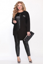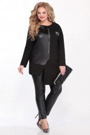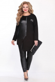 Комплект женский состоит из жакета и брюк. Жакет прямого силуэта с ассиметричным низом. Правая полочка выполнена из иск.кожи. Линия плеча спущена,рукав рубашечный,зауженный к низу. Застежка на молнию смещена в сторону левой полочки. Брюки слегка заужены к низу. Заднее полотнище из трикотажа,переднее из иск.кожи. Пояс широкий на резинке. Длина по спинке жакета 79,5см, длина рукава 44см, ширина рукава на уровне глубины проймы 52-38см, 54-38см, 56-40см. Длина брюк по боковому шву с поясом 96см. Реальные замеры жакета 52 ог-128см, об-118см, 54 ог-130см, об-120см, 56 ог-132см, об-122см. Реальные замеры брюк 52 от-76 от-в растянутом виде 102см, об-100 см, 54 от-80см, от-в растянутом виде 106см, об-104 см, 56 от-84см, от-в растянутом виде-110см, об-108см.