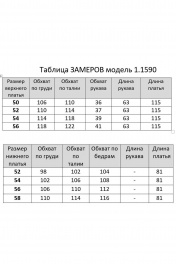 Комплект женский 2-х предметный, состоящий из верхнего платья и комбинации. Верхнее платье из шифона, вырез горловины круглый, воротник стойка с рюшей на завязках. Перед и спинка платья с 3-я воланами, которые присборены. Рукав втачной, длинный, на манжете. В комплект входит комбинация из трикотажной подкладки. Верхнее платье длина по спинке 115см, длина рукава с манжетом 63см, ширина рукава на уровне глубины проймы 50-18см,52-18,5см, 54-19,5см, 56-20,5см. Реальные замеры изделия 50 ог-106см, от-110см, об по второму волану 138см, 52 ог-110см, от-114см, об по второму волану 142см, 54 ог-114см, от-118см, об-по второму волану 146см, 56 ог-118см, от-122см, об по второму волану 150см. Нижнее платье длина спинки 81см. Реальные замеры платья 50 ог-98см, об-104см, 52 ог-102см, об-108см, 54 ог-106см, об-112см, 56 ог-110см, об-116см