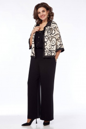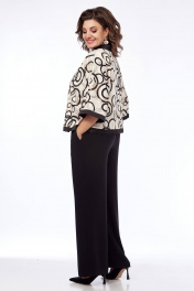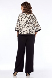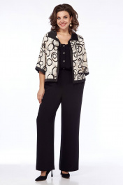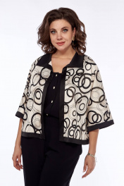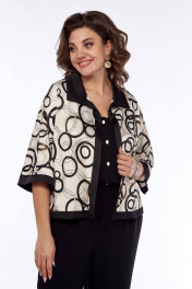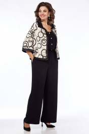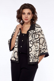 Комплект женский 2-х предметный, состоящий из комбинезона и жакета. Жакет без подкладки, с цельнокроеным рукавом "летучая-мышь", без застежки. Жакет с отложным воротником и центральной планкой, а также с отделочной манжетой по низу изделия. Рукав длиной 3/4, с отрезной манжетой по низу. Комбинезон отрезной по талии, в пояс частично вставлена резинка, с карманами -хулиганами в боковых швах. По переду обработана планка на петли-пуговицы. Комбинезон на широких бретелях, с частичной резинкой.