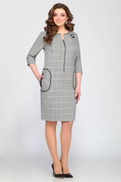 Платье женское, полуприлегающего силуэта. Застежка центральная на молнию. Полочка с нагрудными вытачками от бокового шва и накладными карманами. Листочка,кант горловины и кант кармана из отделочной ткани "кожа".Рукав втачной,3/4. Спинка со средним швом и разрезом. Длина платья по спинке 97,5см, длина рукава 44см, ширина рукава на уровне глубины проймы 50-37см,52-39см,54-41см.