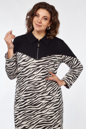 Платье женское прямого силуэта. Выполнено из 2х видов ткани: дизайна и однотона. Платье с отрезной кокеткой по переду, нагрудными вытачками из боковых швов, и стояче-отложным воротником с декоративно-функциональной тесьмой-молнией. Рукав втачной одношовный, с отрезной верхней частью из однотона.