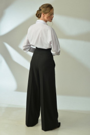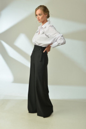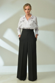 Брюки палаццо, расширенные по низу, с застёжкой "гульфик". Пояс притачной, широкий с декоративной застёжкой на полукольца. Передние и задние половинки с заутюжкой "кант". Карманы в боковых швах. 42 р.: ОТ=66 см, ОБ=94 см. 44 р.: ОТ=70 см, ОБ=98 см. 46 р.: ОТ=74 см, ОБ=102 см. Длина в этих размерах=118 см. 48 р.: ОТ=78 см, ОБ=106 см. 50 р.: ОТ=82 см, ОБ=110 см. 52 р.: ОТ=86 см, ОБ=114 см. Длина в этих размерах=130 см.