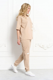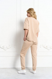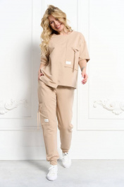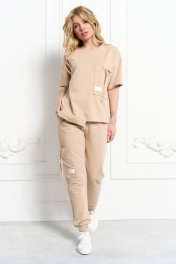 Костюм из трикотажной ткани. Джемпер прямого силуэта со спущенным плечом и втачным рукавом. Низ рукава с цельнокроеной манжетой. Горловина на планке. Перед и спинка — разрезные! Низ — ассиметричный на широкой подгибке. Спереди декоративный нагрудный карман. Брюки свободного кроя с боковыми карманами. Пояс притачной на резинке. Низ на притачной манжете. На правой половинке брюк на боковом шве — декоративный карман. На кармане полочки и брюк — декоративная нашивка. Декоративные нашивки могут изменяться не в ущерб изделию!!!