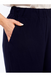 В жакете втачной рукав 3/4, разрезы по низу. Блузка с расширенной горловиной, спущенным плечом. Брюки прямые с боковыми карманами, пояс на эластичной резинке.