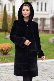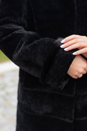 Пальто Линия 19 из овчины (астраган) прямого силуэта. Длина изделия 100 см. Полочки и спинка до бедра цельные, ниже - росшив с замшей. Полуреглан рукав. Норковый кант на манжетах рукавов. Классический глубокий капюшон выступает отличной заменой шапке. Капюшон оторочен норкой. Классическая модель с застежкой на крючки и прорезными карманами.