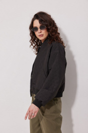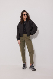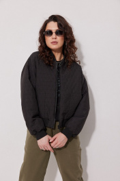 Бомбер свободного силуэта с цельнокроенными рукавами, представлен в черном цвете. Перед с карманами и центральной застёжкой на декоративную тесьму-молнию. Воротник стойка. Низ рукавов и изделия с притачными манжетами из отделочной ткани кашкорсе. Бомбер имеет натуральную подкладку из поливискозы.