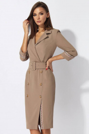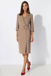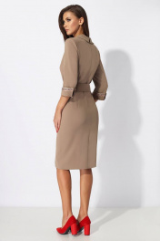 Платье женское полуприлегающего силуэта отрезное по линии талии. Верхняя часть платья с запахом. Воротник пиджачного типа с отложными бортами. Нижняя часть платья с рельефами до низа. С левой стороны шлица с отделочной тесьмой. По центру декоративные пуговицы. Спинка со средним швом и застёжкой на потайную тесьму молния. По линии талии отделочный пояс с пряжкой и блочками,что позволяет регулировать размер талии. Рукав втачной 3/4,с отложной манжетой. По верхнему шву манжеты отделочная тесьма. Длина изделия (по среднему шву)104 см, длина рукава 44 см.