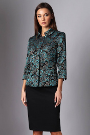 Элегантный женский костюм состоит из жакета и юбки. Жакет полуприлегающего силуэта на подкладке, с застежкой на потайные пуговицы. Воротник отложной на притачной стойке. На полочке клапан с декоративным украшением. Рукав втачной 3/4. По низу рукава разрез.Длина жакета по спинке 58 см., рукав 46 см. Юбка прямого силуэта зауженная к низу на подкладке. Верхний срез юбки обработан притачным поясом с застежкой на петлю пуговицу. На задней половинке юбки средний шов с потайной молнией и шлицей по низу. Длина юбки 64 см.