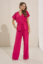 Костюм женский состоит из блузки и брюк.Блузка прямого силуэта с кулисой по линии талии. По плечевым швам отделочная рюша.Застёжка на навесные петли-пуговицы. Брюки широкие на резинке по линии талии.Длина блузки 62 см, длина плечевого шва от начала горловины 28 см,длина брюк 114 см. Подойдет изделие на рост 164 см.