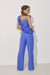 Костюм женский состоит из блузки и брюк.Блузка прямого силуэта с V-образным вырезом по горловине и асимметричной рюшей на полочке и спинке.Брюки широкие от бедра .По линии талии плосколежащий пояс.В боковых швах карман с обрезным бочком.Застёжка на спинке на потайную тесьму молния.Длина блузки 32 см от выреза по спинке, длина от плечевого шва (где рюша) 52 см.Длина брюк 108 см. Подойдет на рост 164 см.