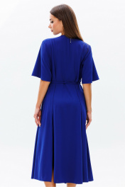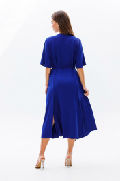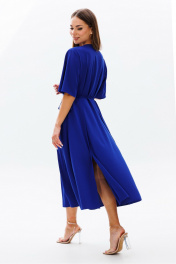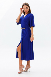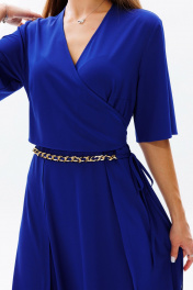 Платье женское отрезное по линии талии.Верхняя часть платья на запах с завязывающийся поясом.На поясе декоративный элемент цепочка.Юбка в платье расширенная к низу с разрезами.Длина изделия 120 см, длина рукава 30 см. Подойдет на рост 164-170 см.
