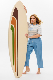 Универсальный и удобный женский брючный костюм для повседневной носки. Футболка свободного кроя, выполнена из мягкой приятной на ощупь вискозной ткани. Горловина — контрастная, рукав укороченный. По переду изделие украшено принтом «carpe diem». Брюки-бананы выполнены из хлопковой джинсовой ткани средней плотности, длина 7/8, по верху на притачном поясе с резинкой сзади. По переду брюки с застроченными складками, застежка на молнию, имеются боковые карманы в швах и задние накладные. Оба изделия смело можно сочетать с другими вещами вашего гардероба и любой по стилю обувью. Длина футболки по спинке 60 см, длина рукава от плечевого шва 28 см. Длина брюк по боковому шву 94 см, по шаговому 64 см. Изделие подойдет на рост 170 см.