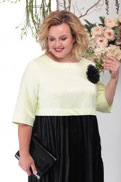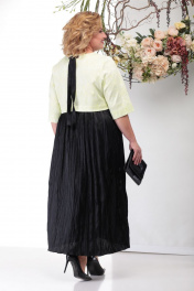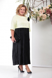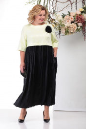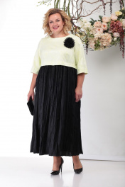 Нарядное платье выполнено из двух контрастных по цвету и типу тканей: струящаяся с жатым эффектом юбка и хлопковый жаккардовый с содержанием стрейча верх. Без подкладки. Чуть завышенная талия зрительно удлиняет фигуру. Горловина округлая и сзади на декоративной завязке. Втачной рукав чуть прикрывает локоть, очень удобная длина на все сезоны, благодаря чистовой широкой подгибке делается короче на 4-5 см. Изделие украшено брошью, которая идет в комплекте. Длина по спинке 128 см.