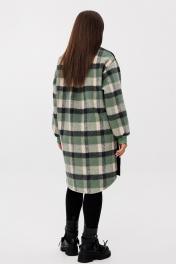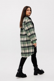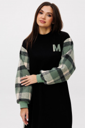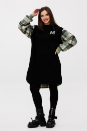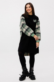 Женское повседневное платье прямого свободного силуэта длиной до колена. Платье из двух скомпонованных видов материалов: перед однотоный 3-х ниточный трикотаж (футер), спинка с рукавами — крупная клетка по верху с небольшим ворсом. Вырез горловины круглый на трикотажной планке; плечо спущенное, длинный рукав расширенный, собран на манжету, втачной одношовный. Перед и спинка цельные, по спинке от горловины небольшая встречная складка, удлиненный фигурный низ. По низу боковых швов — два разреза. Украшением платья служит небольшая нашивка по переду. Платье отлично сочетается с любым видом обуви и может смело комбинироваться с джинсами и легинсами. Длина изделия по спинке 101 +-1 см, длина рукава от горловины 78 см. Изделие подойдет на рост 170 см.