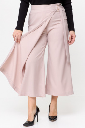 Модные брюки-кюлоты с элегантным запахом, свободной посадки, брючины широкие укороченные, чуть выше щиколотки. По переду молния, сзади по поясу вставлена резинка, запах фиксируется поясом на пряжке. С данными брюками можно смело создавать стильные комбинации с вещами Вашего гардероба. Длина брюк по боковому шву 92 см, шаговому — 62 см. Изделие подойдет на рост 170 см.