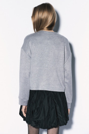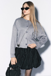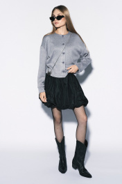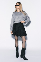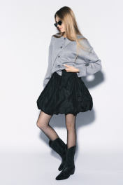 Юбка мини, формы баллон на приточной подкладке, с застежкой молнией в среднем шве заднего полотнища юбки. На талии спереди и сзади встречные складки. Низ с напуском со сборкой.