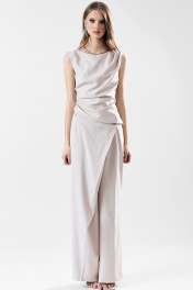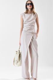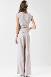 Широкие брюки с асимметричной застежкой-запахом по переду. Карманы в боковом шве. Застежка на пуговицы.
