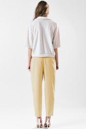Брюки средней посадки по талии, укороченные, декоративная отлетная застежка на поясе на пуговицу. По переду брюк заложена складка для свободы. Карманы в боковых швах.