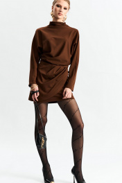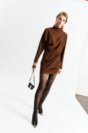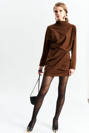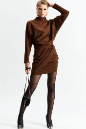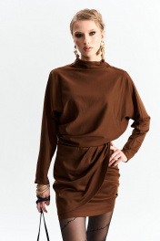 Платье длиной мини, отрезное по линии талии, с цельнокроеным рукавом. Верхняя часть платья объемная, нижняя часть прилегающего силуэта. По линии талии в шов притачивания вставлена эластичная лента. Рукав длинный, зауженный к низу.