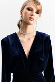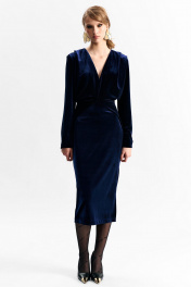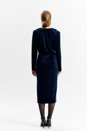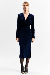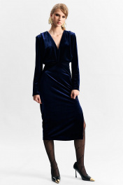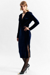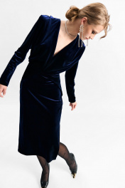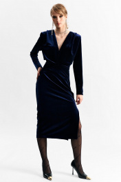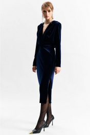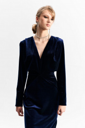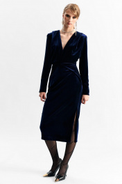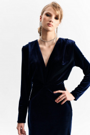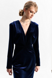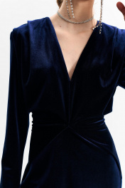 Платье прилегающего силуэта, с акцентными складками по плечу. Заложенные складки по талии. Сбоку - разрез. Платье из плотного бархата глубокого синего цвета.