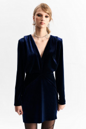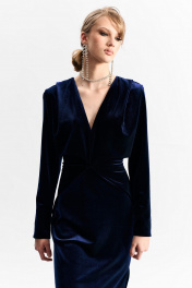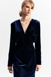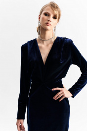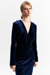 Платье из плотного бархата глубокого темно-синего цвета с акцентными складками на плечах и по талии.