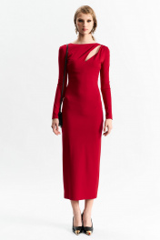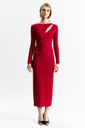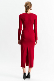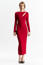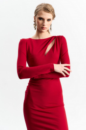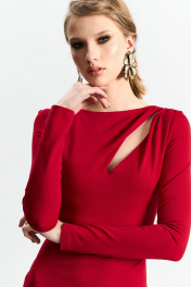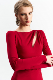 Платье трикотажное, прилегающего силуэта, с застежкой-молнией по спинке. Декоративный вырез-"капля" от плеча. Вырез обработан подкладкой